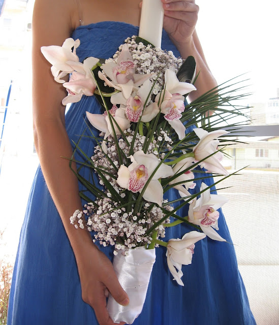 Pe lumanare sunt prinse frunze, floarea miresei, orhidee si saten.